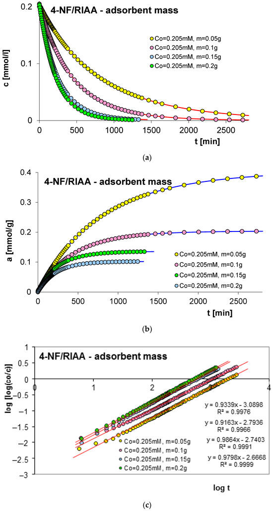 Comparison of the kinetics of adsorption of 4-nitrophenol (4-NF) on RIAA activated carbon at a constant initial adsorbate concentration and variable adsorbent mass presented in the profile of concentration changes over time (a), relative adsorption over time (b) and in Bangham’s linear coordinates (c).
