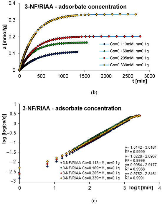 Comparison of the adsorption kinetics of 3-NF on RIAA activated carbon with constant adsorbent mass and variable initial adsorbate concentration presented in the profile of concentration changes over time (a), relative adsorption over time (b) and in Bangham’s linear coordinates (c).