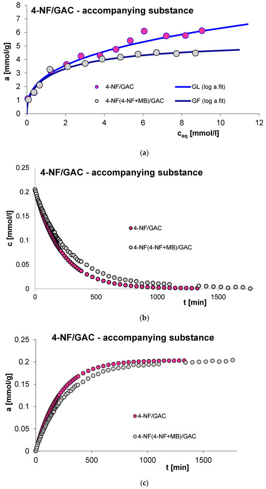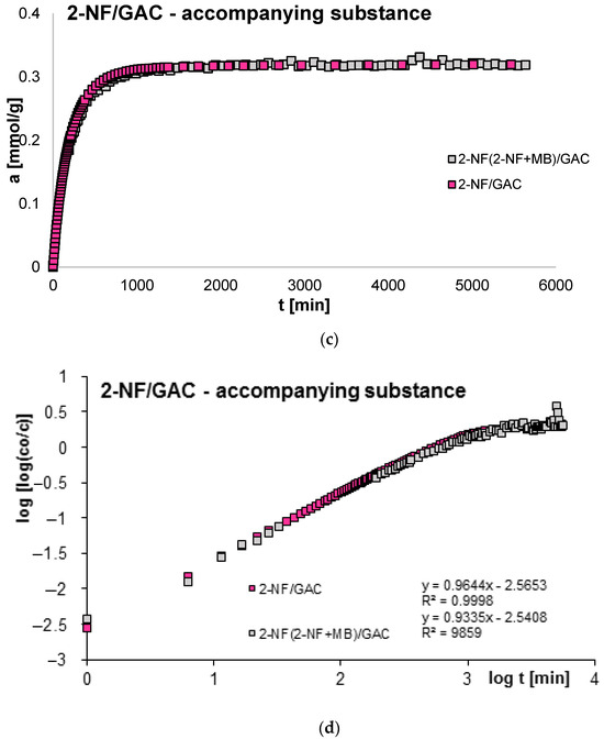 The next factor influencing the adsorption process is the presence of a competing substance. Generally, the rate of the discussed process decreases due to the presence of a co-adsorbate in the experimental system, which is the result of competitive adsorption of solution components. It should also be added that in the case of multi-component systems, smaller adsorbate particles will diffuse more effectively to the adsorbent internal surface. In this study, the influence of the presence of an accompanying substance was investigated for the adsorption of 2-, 3- and 4-nitrophenol (2-, 3- and 4-NF) in systems with methylene blue (MB) on GAC 1240W (GAC) activated carbon. Figure 15, Figure 16, Figure 17 and Figure 18 show a comparison of adsorption isotherms (a) and adsorption kinetics of selected organic compounds on GAC activated carbon in the presence of co-adsorbate presented in the profile of concentration changes over time (b), relative adsorption over time (c) and in linear Bangham coordinates (d).