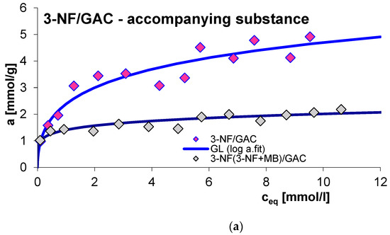 The equilibrium data in the various experimental systems were fitted using the generalized Langmuir (GL) isotherm equation, the parameters of which are listed in Table 7. As can be seen, the isotherms for the MB(MB+3-NF)/GAC system can be described by the Tóth (T) equation. Moreover, the full generalized Langmuir isotherm equation can be used to characterize the adsorption of methylene blue and 3- and 4-nitrophenol in individual systems. In other cases, it is best to use the generalized Freundlich (GF) isotherm. The calculated values of adsorption capacities correspond to those determined experimentally. The quality of the fit is very good, as evidenced by the values of the coefficients of determination (R2 = 0.932–0.988) and the values of standard deviations (SD(a) = 0.019–0.057).
