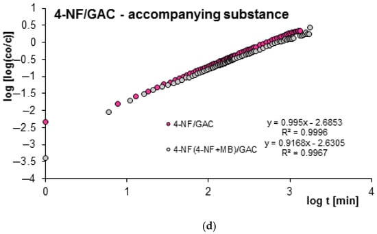 As can be seen, for all systems the adsorbed amount decreases due to the presence of the accompanying substance. This effect can be explained based on the occurrence of competitive adsorption of solution components in the tested experimental systems [59]. Analogous relationships were noted in the case of adsorption kinetic studies for the sorption of nitrophenols in the presence of methylene blue and the sorption of methylene blue in the presence of 4-nitrophenol. In the case of dye adsorption, an increase in the rate of this process was observed due to the presence of 2- and 3-nitrophenol in the experimental system. 2-NF and 3-NF, unlike MB, have very low solubility in water. Generally, compounds with lower water solubility have a greater affinity for the hydrophobic surface of activated carbon. Additionally, the molecules of 2- and 3-nitrophenol and methylene blue differ significantly in size—the 2-NF and 3-NF molecules are much smaller, which facilitates their diffusion into the microporous spaces of the adsorbent [4]. Moreover, in this part of the study, the concentration of 2- and 3-nitrophenol is much higher than the concentration of methylene blue. Considering the above, in the 2-,(3-)NF+MB/GAC experimental system, 2-,(3-)NF is adsorbed on activated carbon faster, which causes the surface of the used adsorbent to become less hydrophobic, and this, in turn, promotes the adsorption of methylene blue. As a consequence, an increase in the adsorption rate of MB in the presence of 2-NF and 3-NF was observed compared to the adsorption in the MB/GAC system. The above effect was not observed for the adsorption of methylene blue in the presence of 4-nitrophenol, which is probably due to the structure of 4-NF. The arrangement of the substituents in the para position mainly favors penetration into the porous structures of the adsorbent. Therefore, the hydrophobicity of the outer surface of the carbon granules changes to a lesser extent.