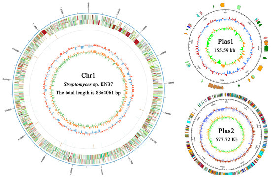 The genome data of Streptomyces sp. KN37 were assembled using the Unicycler software (version: 0.4.8), distinguishing between the chromosomal and plasmid regions. The assembly resulted in one non-circular chromosome (Chr1) and two non-circular plasmids (Plas1, Plas2). Their respective lengths are 8,364,061 bp, 155,588 bp and 577,722 bp. The GC% content for each is 71.49%, 68.82% and 70.92%, respectively. The total length of the Streptomyces sp. KN37 is 9,097,371 base pairs (bp), with a total of 7965 predicted coding genes. The cumulative length of all the coding genes is 7,936,149 bp, accounting for 87.24% of the total genome length (Figure 1).