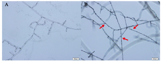 Changes in the mycelia of R. solani after treatment with N-(2,4-Dimethylphenyl)formamide. (A) Growth in 1% DMSO PDA medium. (B) Growth in EC50 N-(2,4-Dimethylphenyl)formamide PDA medium. Red arrows indicate mycelial malformations.