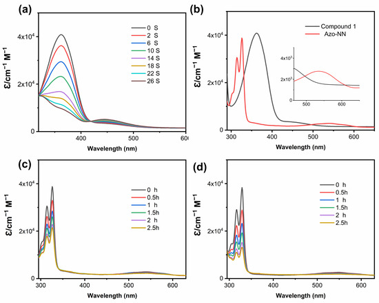 UV absorption spectra at room temperature for samples of 10−5 M. (a) Compound 1 in THF; (b) Azo-NN and Compound 1 in THF (inset—amplification of optical absorption spectra in the visible range from 465 to 650 nm); (c) Azo-NN in DCM; and (d) Azo-NN in toluene.