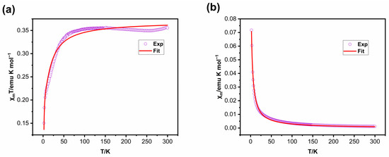 To investigate the magnetic properties of the Azo-NN dimers, its SQUID and X-band EPR spectra were further analyzed. The molar magnetization (χm) of the Azo-NN powder samples was measured using a SQUID magnetometer at 10,000 Oe across a temperature range of 2–300 K to investigate the magnetic exchange properties of the obtained Azo-NN. To ensure accuracy, the experimental data were corrected by subtracting the measurements obtained from empty samples (Figure 3). The analysis of the experimental data was conducted using Equation (1) based on the Bleaney–Bowers Equation (1).