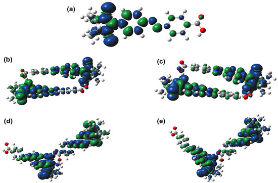 (a) Single radical; (b) ring-closed dimer singlet state; (c) ring-closed dimer triplet state; (d) “L”-type dimer singlet state; and (e) “L”-type dimer triplet state. Calculated at the UB3LYP/6-31G(d) level of theory. The blue and green surfaces represent the α and β spin densities, respectively.