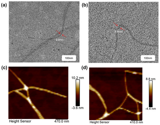 The structure of aggregates formed by Azo-NN at a concentration of 10−4 M in DCM was observed using TEM (Figure 6a). In DCM, elongated fibrous structures were present. The lengths of these fibers vary, with the smallest fibers having a cross-sectional diameter of about 9.8 nm. These morphological features suggest that the “L”-type dimer conformation of Azo-NN in DCM forms fibers with long-range structure. Similarly, the structure of Azo-NN self-assembled in toluene at a concentration of 10−4 M was examined using TEM (Figure 6b). In toluene, the assemblies exhibit a fibrous morphology. However, the fibers have a slightly smaller cross-section than those formed in DCM, with a diameter of approximately 8.6 nm. As the dimer in toluene adopts a closed circular structure, the cross-sectional area of the long-range fiber structure formed is slightly smaller compared to that formed in DCM. The observed self-assembly of fiber formation in toluene is consistent with our previous inference based on EPR spectroscopy. This further suggests that the self-assembly of Azo-NN in DCM adopts a “ring” arrangement. After illumination with UV light at 365 nm, it was disassembled into a spherical shape due to the trans to cis transition of the azobenzene unit, both in DCM and in toluene (Figure S3). For AFM measurements, a DCM or toluene solution of Azo-NN was applied onto the silicon wafer and subsequently analyzed using an AFM. The test results are shown in Figure 6c, and although there are aggregates of various sizes, they are generally 10.2 nm thick. This corresponds to the TEM results we obtained when testing Azo-NN in DCM as a solvent, indicating that Azo-NN formed fibers with a cross-section of approximately 10.2 nm in DCM. And the AFM test in toluene also corroborates its corresponding TEM (Figure 6d), verifying our conjecture.