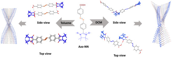 In this research, we synthesized a single radical molecule, namely 4-((4-(1,3-dihydroxy-4,4,5,5-tetramethylimidazolin-2-yl)phenyl)diazo)benzoic acid (Azo-NN). This molecule incorporates an NN group at one end of the azobenzene molecule and a carboxyl group at the other end. The structure can undergo photoisomerization under 365 nm UV light (Scheme 1) [7,28], and the carboxyl group can provide a hydrogen bonding site for supramolecular self-assembly bonding (Scheme 2). This approach allows us to explore the multilevel interactions of small organic magnetic molecules in spatial proximity. Through UV characterization and analysis of EPR data, we observed a significant reduction in photocis–trans isomerization of azobenzene after introducing NN to a (E)-4-((4-formylphenyl)diazo)benzoic acid assembled into one-dimensional helical fibers due to hydrogen bonding. Prior to the introduction of NN, the complete transition from trans to cis under 365 nm UV illumination occurred in approximately 26 s. However, UV illumination experiments conducted after the introduction of NN showed a prolonged conversion time of 2.5 h under the same UV illumination. We attribute this delay to the hindering effect of hydrogen bonding, which occurs after assembly, on the cis–trans isomeric transition of azobenzene [26]. In the EPR data, the spectrum obtained from the degassed toluene test did not exhibit the classical 1:2:3:2:1 five-line spectrum typically associated with NN [29]. Instead, the Azo-NN spectrum showed hyperfine splitting influenced by the neighboring H nucleus, resulting in a tenfold peak pattern of 1:1:2:2:3:3:2:2:1:1. These data suggest that the assembly of Azo-NN is facilitated by the H⋯O interaction between the H on the carboxyl group and the O in NN [30]. Moreover, the test conducted in DCM exhibited another peak pattern, characterized by an asymmetric ten-line peak. This pattern is indicative of a heterogeneous blend between the spectra of single NN and NN affected by H atoms, suggesting a different form of assembly for Azo-NN in DCM. The two different assembled dimers have a subtle difference in their linking modes, and their long-range assembly, observed under a microscope, shows a similar fibrous structure. Therefore, detecting them using conventional methods is a challenge. However, by analyzing the hyperfine splitting effects on the spin-labeled structure of NN of neighboring hydrogen nuclei, we have gained an additional method to distinguish between the two different dimeric morphologies.