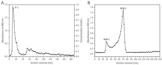 The obtained YCJP was first purified using a DEAE-52 column and Sepharose CL-6B column. Briefly, 20 mg/mL of YCJP was fractioned on the DEAE-52 column [31] and eluted with different concentrations of sodium chloride solution ranging from 0 to 1.0 M. The eluents eluted with different concentrations of sodium chloride solution were collected using an auto fraction collector. After that, the different eluents were further concentrated, dialyzed (Mw cut off: 1000 Da), and freeze-dried. The freeze-dried samples were further isolated using a Sepharose CL-6B column. The distilled water was used as the eluted solution and the eluent was collected and freeze-dried to offer the purified polysaccharides, which were labelled as YCJP–1 and YCJP–2, respectively. The contents of polysaccharides and proteins in YCJP–1 and YCJP–2 were determined using the methods described in Section 2.2.