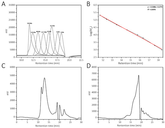 The molecular weight distributions of YCJP–1 and YCJP–2 were calculated according to the linear regression equation obtained from the pullulan standard (Figure 2A,B) [13]. Then, the relative molecular weights of YCJP–1 and YCJP–2 were determined using the HPGPC method, and the results are shown in Figure 2C,D. The results revealed that the molecular weights of YCJP–1 and YCJP–2 were distributed in 74,475–228,443 Da and 848–5810 Da.