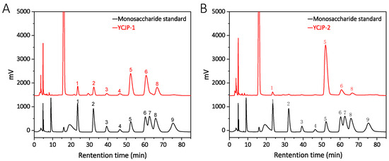 Monosaccharide composition analysis of YCJP–1 (A) and YCJP–2 (B) (1: mannose; 2: rhamnose; 3: glucuronic acid; 4: galacturonic acid; 5: glucose; 6: galactose; 7: xylose; 8: arabinose; 9: fucose).