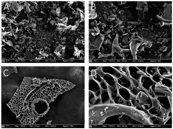 SEM images of YCJP–1 and YCJP–2 after 200- and 1000-times magnification. (A,B) Surface morphology of YCJP–1 (200× and 1000×). (C,D) Surface morphology of YCJP–2 (200× and 1000×).