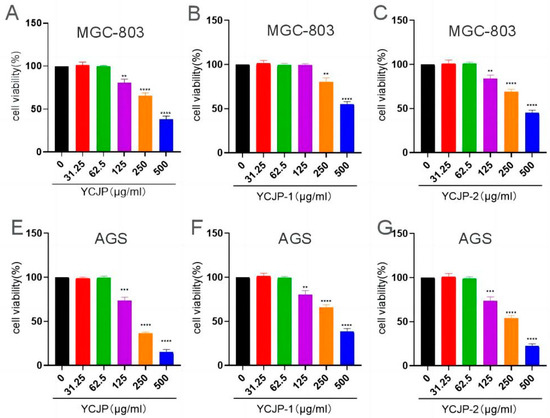 The CCK-8 assay was used to evaluate the anti-gastric activities of YCJP, YCJP–1, and YCJP–2. In brief, cells (AGS or MGC-803) were seeded in 96-well plates at a density of 5 × 103 cells per well and further incubated at 37 °C for 24 h. Then, different concentrations of YCJP, YCJP–1, and YCJP–2 (31.3, 62.5, 125, 250, and 500 μg/mL) were added into the 96-well plates and further incubated with cancer cells for 48 h. Subsequently, CCK-8 solution (10 µL) was added into the 96-well plates and further incubated at 37 °C for 2 h. After incubation, the absorbances in each well were then recorded using a multimode reader at 450 nm. The effects of YCJP, YCIP-1, and YCJP–2 on the cell viability of AGS and MGC-803 were then calculated according to the obtained absorbances.