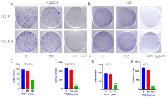 Colony-forming efficiency refers to the cell vaccination survival rate, which represents the number of cells that survived and formed clones after inoculation [23]. In order to further evaluate the anti-cloning effects of YCJP–1 and YCJP–2 on tumor cells, the colony-forming assay was carried out in this study. As suggested from Figure 7A,B, it was found that the purple crystal in the YCJP–1 and YCJP–2 treated group was obviously decreased when compared to the not polysaccharide-treated group, indicating that YCJP–1 and YCJP–2 could effectively inhibit the proliferation of MGC-803 and AGS cells. The inhibitory effects were further quantified, and the results are shown in Figure 7C–F. As expected, both YCJP–1 and YCJP–2 could effectively inhibit the colony number of MGC-803 cells (p < 0.001) with a concentration of 600 μg/mL. As shown in Figure 7C,D, the colony numbers of MGC-803 cells in the YCJP–1 and YCJP–2 treated groups were 50 and 70, which were 4.5 and 3 times lower than that of the vehicle control group (0 μg/mL) (Figure 7C,D). In addition, for ASG cells, similar results were observed, further confirming that YCJP–1 and YCJP–2 possess prominent anti-gastric cancer activity via inhibiting the colony and proliferation of cancer cells.
