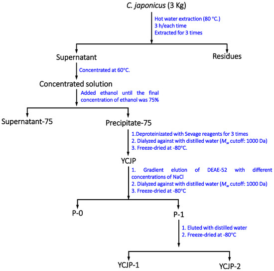 The dried C. japonicus herbs (3 kg) were crushed to a powder and immersed in 20 L of anhydrous ethanol for 3 weeks to remove the small-molecule substances. After that, the C. japonicus herb powder was further re-dried and extracted with 20 L of distilled water at 95 °C for 2 h using an extraction tank (50 L). The extraction process was repeated twice, and the decoction was combined and concentrated to one tenth of the original volume using a rotary evaporator at 60 °C. Subsequently, anhydrous ethanol was added into the concentrated water extracts of C. japonicus herbs until the final concentration of ethanol was 75%. The mixture was stored at 4 °C overnight. The precipitate was collected the next day and redissolved in 2 L of distilled water. After that, the polysaccharide solution was further deproteinated using Sevage reagent (chloroform and n-butanol = 4:1) three times. The deproteinization solution was then concentrated and dialyzed with running water for 48 h (Mw cut off: 3500 Da). Then, the dialysate was collected, concentrated, and freeze-dried at −80 °C to obtain the crude polysaccharide and labelled as YCJP. The detailed extraction process of YCJP–1 is shown in Figure 8.
