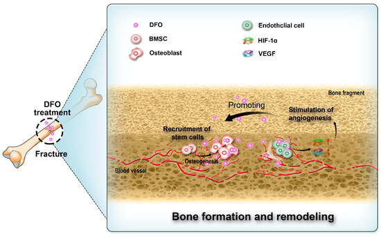 In recent years, researchers have made fresh attempts to use DFO treatment in bone repair. Biomimetic materials produced by 3D printing offer a good treatment method for bone transplantation after major defects, and they also make up for the disadvantages of bone autografting [120]. Although the scaffold-based approach has a great therapeutic potential, it relies on the construction of new blood vessels for regeneration; thus, induction of neovascularization at the site of regeneration is crucial [121]. Justin Drager et al. used 3D technology to print biomimetic materials which were transplanted into a rabbit model of bone segmental defect and, through local injection of DFO, increased the formation of blood vessels at the injured site, creating an environment conducive to bone repair [120]. The findings present a novel concept for the design of bone scaffolds with potential for vascularization.