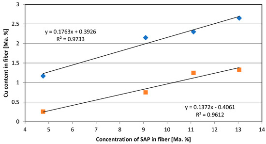 Fibers were produced with varying SAP concentrations and loaded with the same CuSO4·5H2O solution following the same procedure (concentration, time, temperature). Cu was measured in dried fibers directly after production and after 20 washing cycles (Figure 1). The loss after washing can be estimated to approx. 40%. Both series of measurements follow a linear dependence. Cu binding is influenced only by SAP concentration. Diffusion effects, the accessibility of the COO− groups of SAP inside the cellulose skeleton and the exchange with existing sodium (Na) ions bound to SAP have no impact.