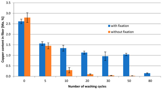 To investigate the necessity of Cu ion fixation inside the fiber, washing trials were conducted with a loaded fiber without Na2CO3 fixation and compared to a fiber with Na2CO3 fixation. Figure 2 represents the Cu content of both fibers after 50 washing cycles. After 10 washing cycles, the fiber without fixation already lost approx. 90% of the original Cu content, and after 50 washing cycles, only traces of Cu could be detected. In contrast, the fixation ensures a loss of only approx. 50% after 10 cycles and 60% after 50 washing cycles (significant difference according to t-test; p = 0.95; f = 4). A total of 50 washing cycles is usually applied to simulate the lifespan of a textile fabric. Apart from that, the maintenance of a function (agent) inside textiles is challenging in view of depot and release mechanisms.