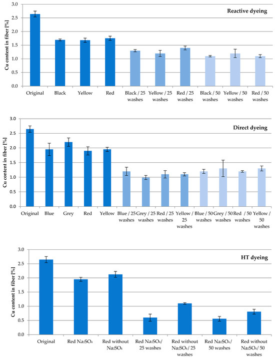 Subsequent household washes resulted in further losses. Whereas the Cu content after 25 washing cycles averaged 49% for reactive and 41% for direct dyeing, HT dyeing resulted in higher losses of Cu, resulting in 32%. Compared to reactive and direct dyeing, the HT process conditions of a high temperature and pressure exhibit an increased challenge in fiber processing.
