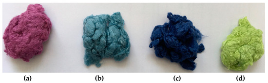 As an example, Figure 4 shows the resulting color shades after direct dyeing processes. The blue color of the original fiber prevails, and the shade of the color changes as expected.