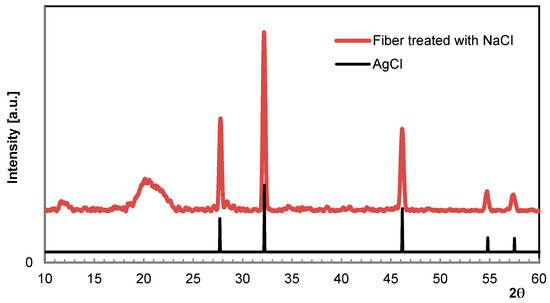 As starting point for these investigations, a previous study should be referenced here to introduce the reliability of XRD measurements [15,16]. In order to immobilize Ag ions permanently, AgNO3-loaded fibers were allowed to become remoistened in a NaCl solution, resulting in AgCl precipitation. Although known to be insoluble, the quantity of ions released either by the dissociation or formation of elementary Ag when exposed to light is sufficient for inducing a significant and long-lasting antibacterial effect. The presence and durability of AgCl crystallites in the fiber was verified by XRD [17]. Figure 5 shows the XRD scan of a fibrous specimen taken after a prolonged long storage period. In fact, the grey appearance of the fiber might be an indication of Ag separation, but no additional crystalline phases were found. Table 2 summarizes the scattering angle 2θ according to the Miller indices (hkl) available from the database [18].