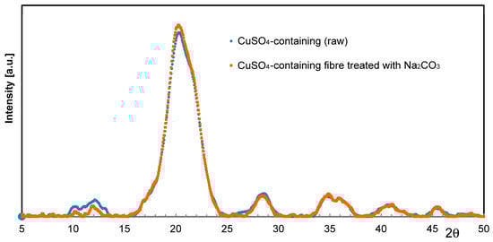 Considering the previous statements on Ag, especially in light of the fastness to washing, Cu immobilization is supposed to follow a similar reaction mechanism at precipitation. Rather than raising the pH value by caustic addition, soda might precipitate Cu inside the cellulose fiber matrix in a more efficient way. When treating Cu-loaded fibers with Na2CO3 solutions, slight color intensification is usually observed. However, no conceivable crystalline phases such as for instance Malachite (CuCO3·Cu(OH)2) or Posnjakite (Cu4[(OH)6|SO4]·H2O) could be detected by means of XRD (Figure 6).