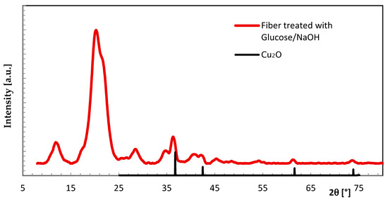 WAXS scan of Cu fiber treated with glucose/NaOH in comparison to Cu2O scan (database [18]).