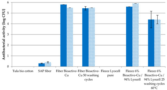 Figure 8 displays the antibacterial effectivity of Cu fiber against Gram-positive Staphylococcus aureus and Gram-negative bacterium Klebsiella pneumonia. As referenced, Tula bio cotton, unloaded SAP fiber and pure Lyocell fleece were used to exclude the antimicrobial properties of other materials. Cu fiber shows a strong antibacterial effect, even after 50 household washing cycles of >5 log CFU. The reduction in Cu content after 50 washes by ca. 60% does not cause a reduction in antibacterial effectivity.