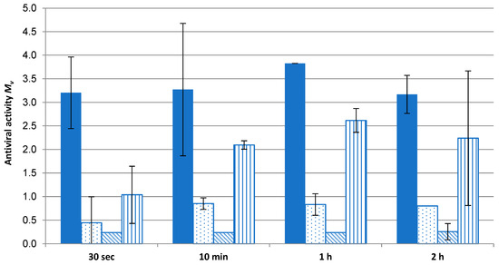 These results indicate the need for higher Ag ion concentrations compared to Cu ion concentrations to reach antiviral activity, as described by Meister et al. [4]. Even Cu compounds like Cu2O, Cu2S or CuCl retain their anti-infective properties [19] in comparison to Ag compounds. Only one competitor sample (fleece 3) can be evaluated as log 2 after 10 min. PHMB, mainly used to inhibit bacteria during wound healing, does not reach the antiviral effectivity of Cu. Wang et al. [20] reported that a PHMB-treated spandex fabric can kill 99% (log 2) of coronavirus within 2 h of contact.