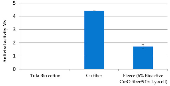 Cu fiber fixed with Cu2O was used to investigate the antiviral effect against enveloped bacteriphage phi6 viruses. Polyester and an unloaded SAP fiber were used as references. A pronounced antiviral efficacy was observed with a value of >log 4 for the original fiber as well as after 50 washing cycles (Figure 9, Table 4). Although the Cu concentration was reduced to 109 mg/kg, this amount ensureed efficient inactivation of the viruses. Prepared Cu2O fleece with a share of 6% Cu2O fiber and 94% Lyocell fiber showed an antiviral activity of >log 3 (Figure 10).