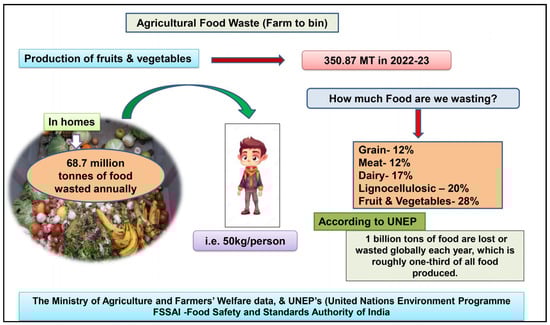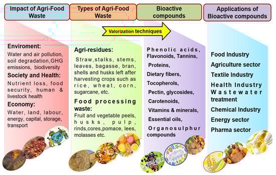 Currently, agricultural challenges revolve around meeting the needs of global consumers for sufficient food production. However, the emphasis must be on implementing sustainable practices to prevent the generation of pollution and waste stemming from agricultural activities. Likewise, the world population has risen from 3.7 billion to 7.9 billion in the last 50 years, and according to a new United Nations report, in 2030, it is expected to reach 8.6 billion, 9.8 billion in 2050 and 11.2 billion in 2100. However, high production of crops produces huge amounts of agricultural waste. These wastes release hazardous substances into the soil and water and release greenhouse gases (GHGs) into the atmosphere; about 21 to 37% of GHG emissions are emitted by the agricultural sector [,]. The agri-food industry also generates a huge quantity of organic waste and biomass [,], which not only creates safe disposal issues but also has an adverse impact on the environment and society. To cope with these problems, there is an urgent need to extract and recover value-added products (bioactive compounds) from waste by using different technologies and utilization of these compounds to develop various valorised products, including functional foods or dietary supplements. Agri-food wastes are also an abundant source of natural and low-cost biomolecules, including carbohydrates, lipids, proteins, vitamins, etc. []. Therefore, the cost-efficient utilization of agri-food waste and byproducts will contribute to reducing environmental concerns and playing a prominent role in food processing, agriculture, cosmetics, pharmaceutical industrial applications and succeeding sustainability and circular economy concepts with innovative approaches [].