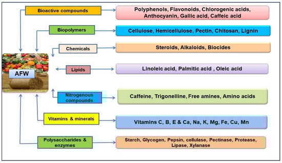Agricultural food residues (plants, fruits, vegetables, cereals, etc.) produce billions of tonnes of waste at various stages of the food chain (production, handling, storage, processing, packaging, distribution, marketing and consumption) and have a negative impact on the environment and human health. In this way, there is a need to develop an innovative methodology for the utilization of these wastes into high-value-added products. Moreover, agriculturally derived lignocellulosic biomass like straw, stalk, stover, husk, bagasse, leaves, seeds, etc. [,] consists of cellulose (40–60%), hemicellulose (10–40%) and lignin (15–30%). Generally, agri-food residues including peels, pulp, seeds, shells, pomace, husks, straws, barks, bran and leaves [] and the inedible parts of fruits (peel, pulp, seeds, pomace, etc.) and vegetables (stems, leaves, husks, shells and seeds) are organic materials which constitute an important source of phytonutrients (bioactives) [,]. A bioactive compound is a natural biological phytoconstituent or substance that can activate a physiological response in a living organism and have many beneficial effects on human health as well. Agri-food waste having different type of compounds like phenolics, peptides, polyphenols, tannins, alkaloids, carotenoids, terpenes, flavonoids, flavanols, anthocyanins, essential oils, etc., along with carbohydrates, enzymes, fatty acids, dietary fibres, lipids, biopolymers, nitrogenous compounds, minerals, vitamins, amino acids, chemicals and other phytoconstituents (Figure 2) [,].