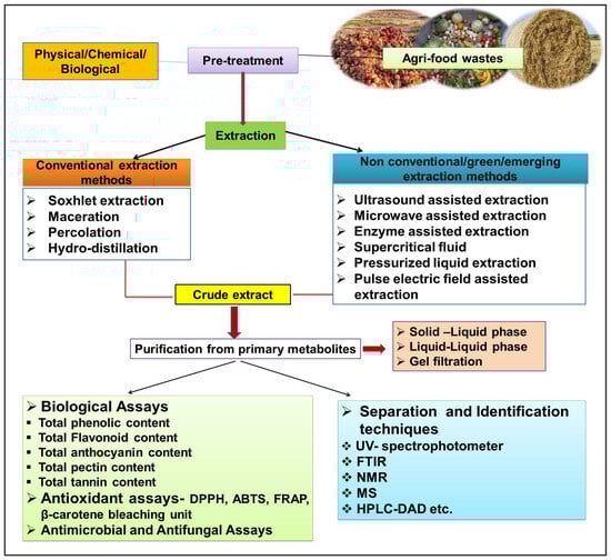 The valorisation of agri-food waste is a useful and innovative technology for the production of value-added products such as bioactives, biopolymers, chemicals, nutraceuticals, antioxidants, biopeptides, antibiotics, industrially important enzymes, bio-nanocomposites, polysaccharides, lipids, vitamins, minerals, pigments, polyphenols, fatty acids, etc. that could be recovered from these wastes and used as a potential substrate for applications in food, agriculture, health, pharmaceutical, cosmetic and environment sector []. In addition, conventional (Soxhlet, maceration and hydrodistillation) and emerging (supercritical fluid, subcritical fluid, microwave-assisted, ultrasonic-assisted, enzyme-assisted and pulsed electric field-assisted) techniques, along with separation, isolation and identification by different analytical methods and quantification using various chromatographic and spectrophotometric methods and then identification and characterization of compounds as summarized in the flow chart shown in Figure 3.
