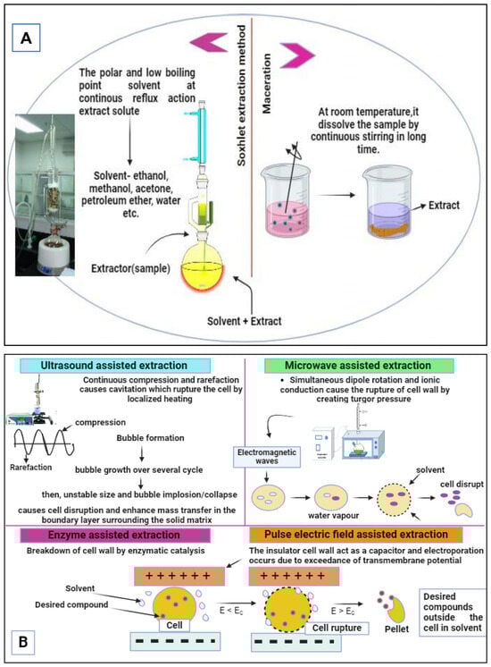 Schematic diagram detailing available conventional (A) and nonconventional (B) extraction technologies along with their respective mechanisms of action.