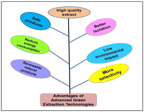 Emerging extraction techniques are rooted in non-thermal principles, aiming to facilitate extraction without the risk of overheating the waste matrix, all while reducing energy consumption []. The innate moisture content present in agriwaste causes molecular perturbations as external energy sources. To overcome this challenge, microwave and ultrasonication methods are harnessed for residues with elevated moisture levels. When water usage proves unfeasible, ethanol emerges as the preferred solvent. The yields of bioactive compounds after extraction depend upon various factors, i.e., extraction method, physio-chemical attributes of the waste material, type of solvent, temperature, time, pressure, etc. The non-conventional extraction methods have numerous advantages over conventional methods, as depicted in Figure 5. These advanced green extraction technologies have many applications in food as well as environment.