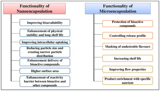 Encapsulation technology encompasses two primary methods: micro-encapsulation and nano-encapsulation. Both techniques offer distinct advantages for enhancing product functionality as shown in Figure 6. Nanoencapsulation and microencapsulation refer to the particle size of capsules, with nanoencapsulation involving sizes ranging from 10 to 1000 nm and microencapsulation having a size range of 3 to 800 μm []. Nanocapsules offer a larger surface area, which enhances solubility compared to microcapsules. Additionally, nanocapsules play a crucial role in improving bioavailability and achieving sustained release of drugs, enabling precise targeting of active compounds. These techniques involve coating with bioactive core compounds as a wall material, creating capsules that act as effective barriers against environmental and chemical interactions. They enhance encapsulation efficiency, offer substantial loading capacity, improve bioavailability, ensure stability, enable controlled sustained release and provide flavour-masking capability. These distinctive attributes collectively position nano-encapsulation as a powerful and promising venue for encapsulating bioactive compounds. The multifaceted benefits it offers contribute to its growing prominence as a preferred method for optimizing the delivery and effectiveness of bioactive compounds in various applications [].