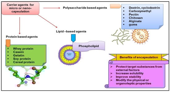 Encapsulation is a novel and efficient process that involves covering one or more active substances that are coated with materials, core or internal phase and loaded in a homogenous or heterogeneous matrix which can be a shell, wall or carrier material at 1–5000 μm or nano (<1 μm) scale. After that, the molecules are entrapped and protected from the deteriorating exterior conditions like degradation, evaporation and oxidation. It is a method that improves the transport of bioactive chemicals and living cells into foods by encasing active substances within a carrier material (lipids, proteins, carbohydrates or waxes). The encapsulated materials depend on a number of variables, including their chemical and physical characteristics, suitability for the intended culinary application, impact on the final food product’s sensory and visual aspects and carrier material cost. Even though there are many processing choices, choosing an appropriate carrier system is frequently the first step in the product development process. Carriers differ greatly in terms of both price and encapsulation performance [].