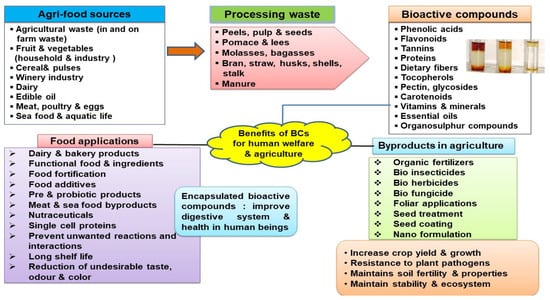 At present, consumer interest in food products with bioactive ingredients is primarily directed towards those that are free from artificial and synthetic additives. Natural bioactive compounds characterize a special group of health-related molecules that could be applied in a great variety of food classes: functional foods, nutraceuticals, dietary supplements and used as food additives, providing consumers with a natural and sustainable alternative to synthetic ones [,]. One of the current efforts towards increased ingredient stability, controlled release of the bioactive compounds and increased product shelf-life is the use of encapsulation technology. The main drives of the encapsulation approach are to improve the stability of sensory properties, solubility, bio-availability, retention of bioactive properties and microstructure, reduction of hygroscopicity and increase the shelf-life of desired products. Edible films or coatings are mainly made up of carbohydrates (cellulose, modified starch, alginate, agar, maltodextrin, cyclodextrins, pectins and chitosan), proteins (casein, corn zein, whey protein, gelatine, wheat gluten and soy protein) and lipids (waxes, paraffins, hydrogenated vegetable oils, phospholipids, acetoglyserides, shellac resins, mono- and triglycerides) through common encapsulation approaches such as spray-drying, freeze-drying, coacervation, ionic gelation, crystallization, microencapsulation, electro-spinning, emulsification and extrusion-produced encapsulated bioactive compounds from agri-food wastes. The suitability of encapsulation techniques would be based on the entrapped method of bioactive compounds and their combination with the wall, encapsulating and carrier materials of different origins (like solution, polymers, an emulsion, dispersion, gelling etc.) and their applications []. Moreover, there is a dire need to study the bioavailability of bioactive compounds for food and agricultural applications, as well as production at pilot and commercial scales for industries. The encapsulation technique used for polymeric-based matrices is a good approach for bioactive compounds extracted from agri-food wastes and their applications in food and agriculture sector.