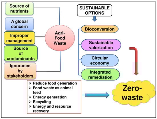 A schematic representation of current challenges, future perspectives and sustainable options for the valorisation of agri-food waste.