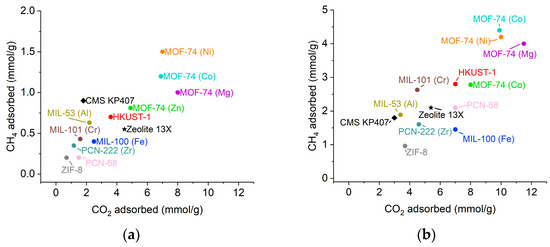 (a). CO2 and CH4 adsorption capacities comparison for different MOFs at 298 K and 1 bar. (b) CO2 and CH4 adsorption capacities comparison for different MOFs at 298 K and 5 bars.