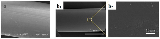 (a) SEM image of neat PLA filament. Image reproduced from [55]. (b1,b2) SEM image of neat TPU filament at different magnification. Images reproduced with permission from [56].