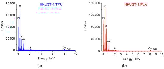 The EDS spectra of HKUST−1/TPU and HKUST−1/PLA are presented in Figure 5a and Figure 5b, respectively. Qualitatively, the peaks corresponding to the expected main elements in the composites are evident, namely, C, O, and Cu. C and O elements were present in both HKUST−1 and the polymeric binder, whereas the Cu element was only present in the pristine HKUST−1. It should be noted that the difference in an element’s relative content in HKUST−1/TPU and HKUST−1/PLA was not exploited as the samples that were used for the analysis were not flat, which rendered the quantitative analysis of EDS unreliable. Nevertheless, the presence of element peaks in the composite was similar to the EDS spectra of the pristine HKUST−1 powder reported in other studies [57,58], which is indicative of the preservation of the HKUST−1 crystals in both composites.