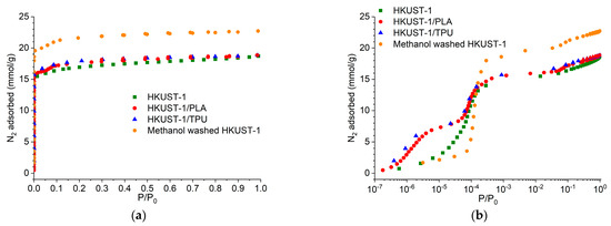 N2 adsorption isotherm plot for HKUST−1/TPU, HKUST−1/PLA, pristine HKUST−1 and methanol-washed HKUST−1 in (a) linear scale and in (b) log scale. Data for HKUST−1/PLA and HKUST−1 was taken from previous work [46].