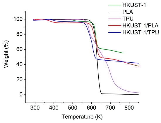 The TGA profiles for pristine HKUST−1 and its composites, as well as for the neat PLA and TPU, are shown in Figure 8. The pristine HKUST−1 was thermally stable up to 593 K, whereas PLA started to degrade at 613 K. Meanwhile, the thermal degradation behavior of TPU can be divided into two stages; the first stage of decomposition occurred between 553 K and 613 K, while the second stage occurred between 663 K and 733 K. The reason for the two-stage degradation was related to the decomposition behavior of urethane bonds in the hard segments and polyol groups in the soft segments of the TPU polymer [60,61].
