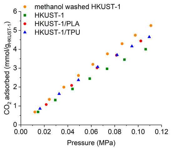 Normalized CO2 adsorption isotherms compared for pristine HKUST−1, methanol-washed HKUST−1, HKUST−1/PLA and HKUST−1/TPU.
