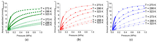 Gravimetric adsorption isotherms of CH4 and CO2 at different temperatures for (a) pristine HKUST−1, (b) HKUST−1/PLA, and (c) HKUST−1/TPU. Continuous line represents dual-site Langmuir modeling, whereas filled and unfilled symbols represent CO2 and CH4 adsorption, respectively. Isotherm data for pristine HKUST−1 and HKUST−1/PLA were taken from previous work [46].