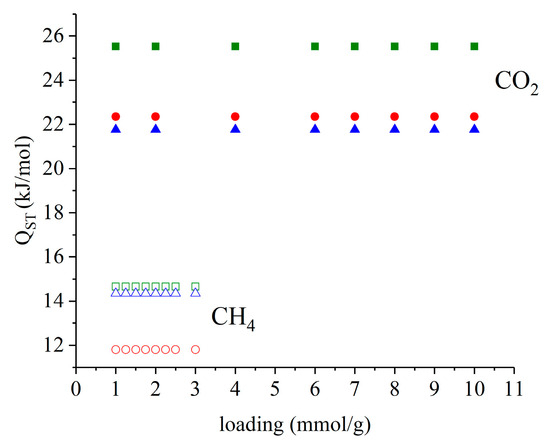 The application of the dual-site Langmuir model to describe the experimental CO2 adsorption isotherms up to 10 bars reveals that the monolayer saturation capacity of adsorption site 1, qs1, was higher than the monolayer saturation capacity of adsorption site 2, qs2, for all the samples. It is likely that qs1 corresponds to the saturation of the polarized adsorption sites located near the open-metal sites of HKUST−1, whereas qs2 describes the monolayer saturation capacity over sites near the ligand, as proposed in [13,67]. In the case of CH4, the values of qs1 derived from the dual-site Langmuir model were found superior to qs2 for all the samples. However, according to the literature [13,68], the preferential adsorption sites of CH4 on HKUST−1 were located in the octahedral cages of the ligand, whereas adsorption close to the metal sites was less favored due to their lesser accessibility. Therefore, qs1 most likely represents the monolayer CH4 saturation capacity near the ligand, whereas qs2 describes the adsorption capacity of CH4 for the sites near the open-metal sites of the HKUST−1 crystalline structure.