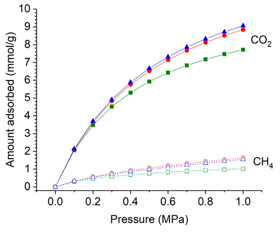 Biogas upgrading can be achieved via numerous technologies, such as water/physical/chemical scrubbing, cryogenic separation, membrane separation, pressure swing adsorption (PSA), and vacuum pressure swing adsorption (VPSA) [5,6]. In the context of this study, we are interested in the removal of CO2 from biogas via PSA, avoiding the use of a vacuum in the desorption step that would then be replaced with desorption in atmospheric pressure. Because vacuum desorption is mainly responsible for the high energy costs of VPSA processes, better energy performances by PSA separation are foreseen. The choice of adsorbent is one of the key factors in designing such a process.