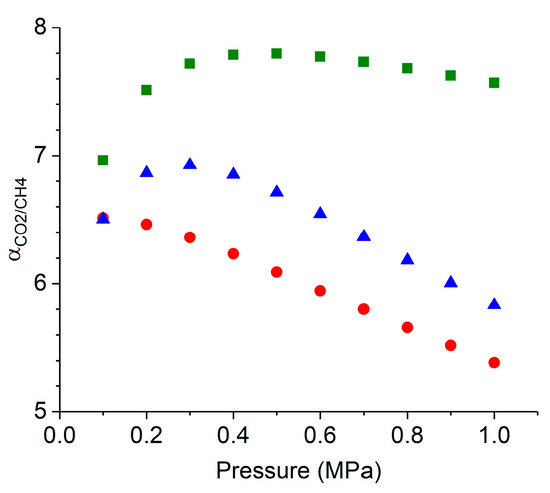 All the samples exhibited a better affinity towards CO2 than CH4. For all the materials, the ratio of equilibrium capacities of pure components was around 2. The prediction of co-adsorption isotherms via IAST allowed for the determination of the equilibrium selectivities of an equimolar binary mixture. Figure 14 presents the CO2/CH4 co-adsorption selectivities as a function of the equilibrium pressure at 298 K for HKUST−1/TPU, HKUST−1/PLA, and the pristine HKUST−1, respectively. It could be observed that CO2 was more preferentially adsorbed than CH4 for all the materials. Additionally, pristine HKUST−1 had the highest selectivity value in the whole equilibrium pressure range, followed by HKUST−1/TPU and HKUST−1/PLA. Furthermore, as the equilibrium pressure was greater than 3 bars, the selectivities of HKUST−1/TPU and HKUST−1/PLA were noticeably diminished, even if the variations remained small, whereas the selectivity of the pristine HKUST−1 did not vary significantly. This could be explained by the larger CH4 adsorption capacities of the composites, which lowered the separation selectivity despite their larger CO2 adsorption capacities. When comparing both the composites, HKUST−1/TPU was shown to be slightly more selective towards CO2 than HKUST−1/PLA, as the former had a slightly lower CH4 adsorption capacity than the latter.