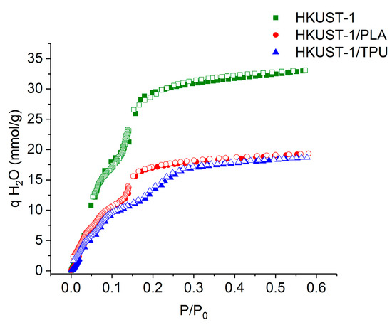 HKUST−1 is known as a MOF that is sensitive to water as the open-metal sites of HKUST−1 have a high affinity with water molecules, which results in the formation of Cu-O bonds and thus leads to the disintegration of the HKUST−1 framework [72,73]. Figure 15 displays the H2O adsorption isotherm for HKUST−1/TPU, HKUST−1/PLA, and pristine HKUST−1 at 298 K. As expected, the pristine HKUST−1 was able to adsorb a larger quantity of water than the extruded composites when the relative humidity (RH) increased. Furthermore, the accessible pores of the pristine HKUST−1 sample started to be completely filled with water at P/P0 ≈ 0.17. Meanwhile, the presence of either TPU or PLA in the composite had an effect on lowering the quantity of the adsorbed water molecules as the relative pressure increased. It is possible that the polymeric binder partially hindered the access of the water molecules to certain open-metal sites in HKUST−1. Interestingly, it can be noticed that the accessible pores in HKUST−1/PLA started to be filled with water at a similar relative pressure as pristine HKUST−1, while this was not true in HKUST−1/TPU as the accessible pores only started to be filled at P/P0 ≈ 0.27, which could be a result of the hydrophobic nature of TPU reducing the interaction intensity of the MOF open-metal sites with the water.
